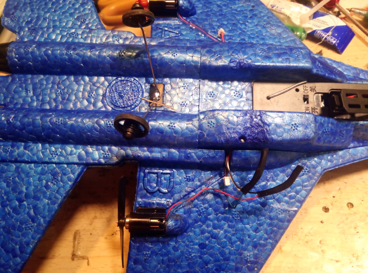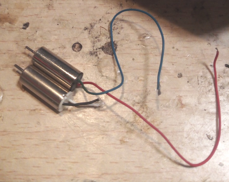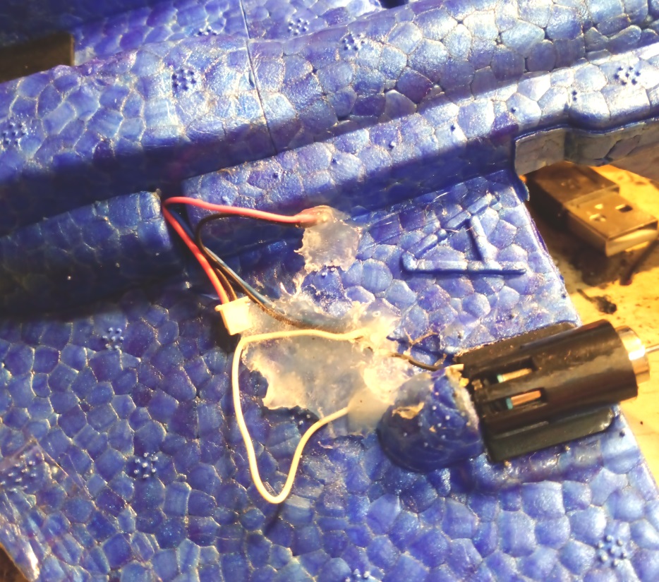 If there is a need to connect a replacement motor to the plane’s control unit and the wire colors do not match, keep in mind that red should be wired with black and blue should be wired with white. The motor will not spin in the proper direction if you get this wrong. And use hot glue to protect the wire connections (so to secure them).
