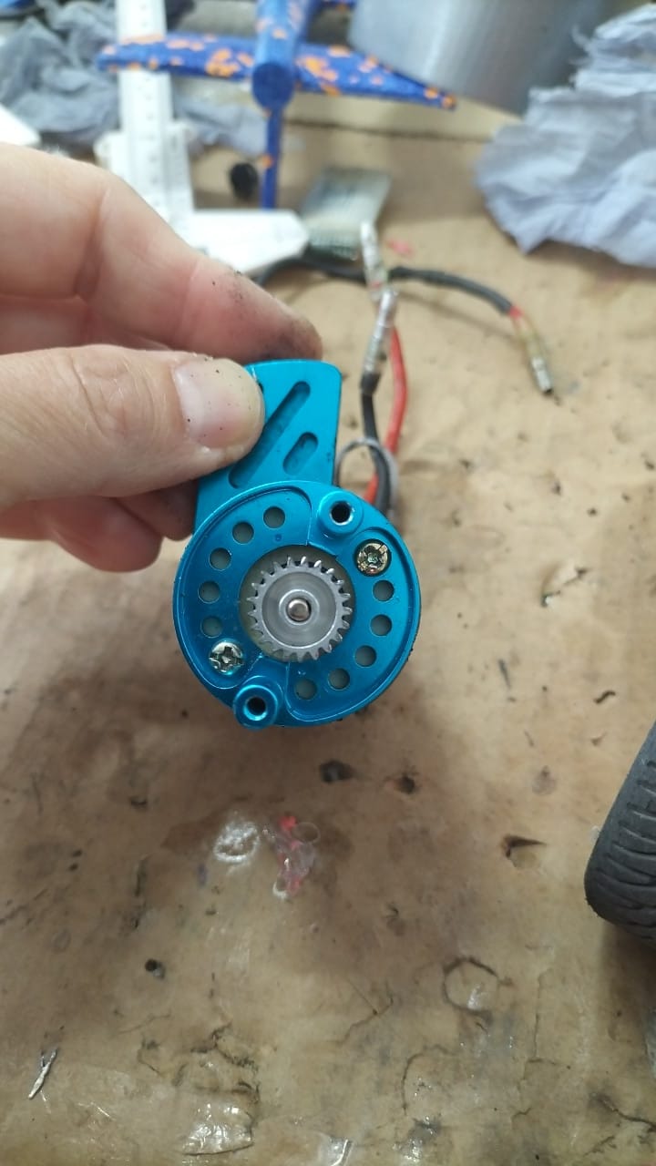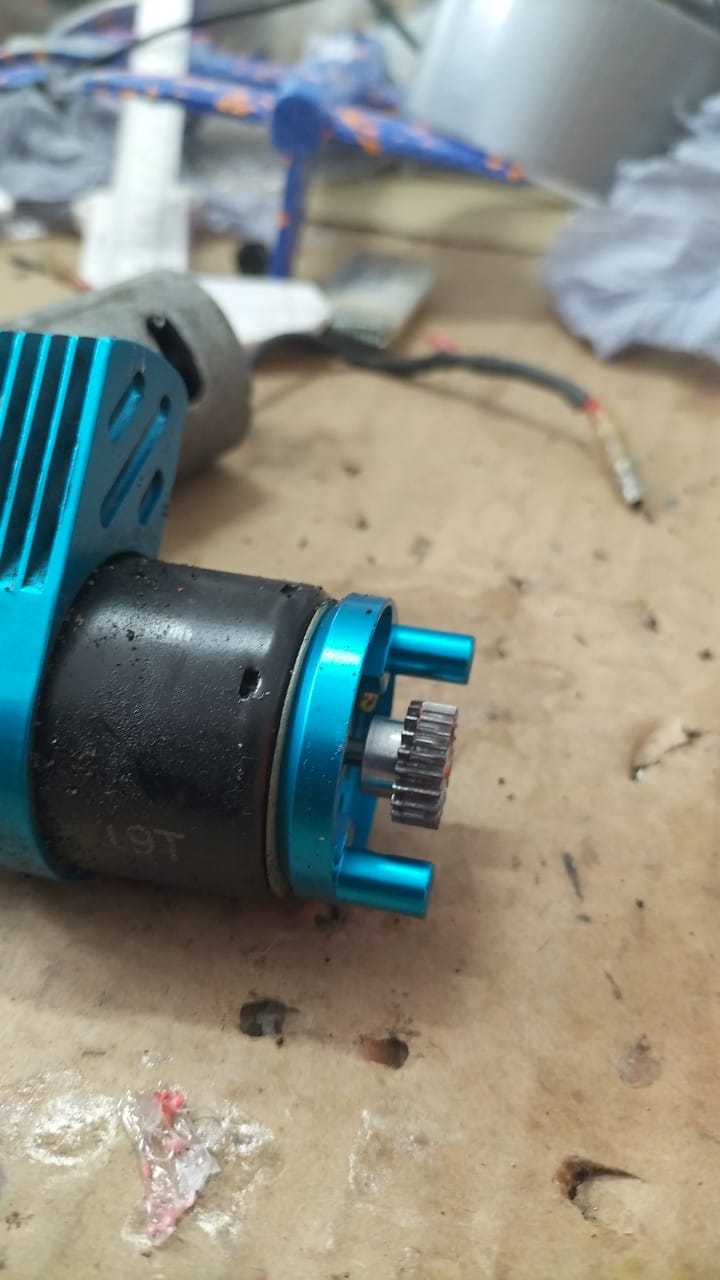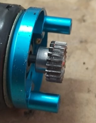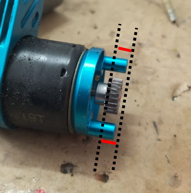 As you can see from the photo, the TA02 pinion positioning along the motor shaft is kinda guesswork. If it is too much to the outside it will scratch the gear cover. If it is too much to the side of the motor, the pinion will be subject to uneven wear.