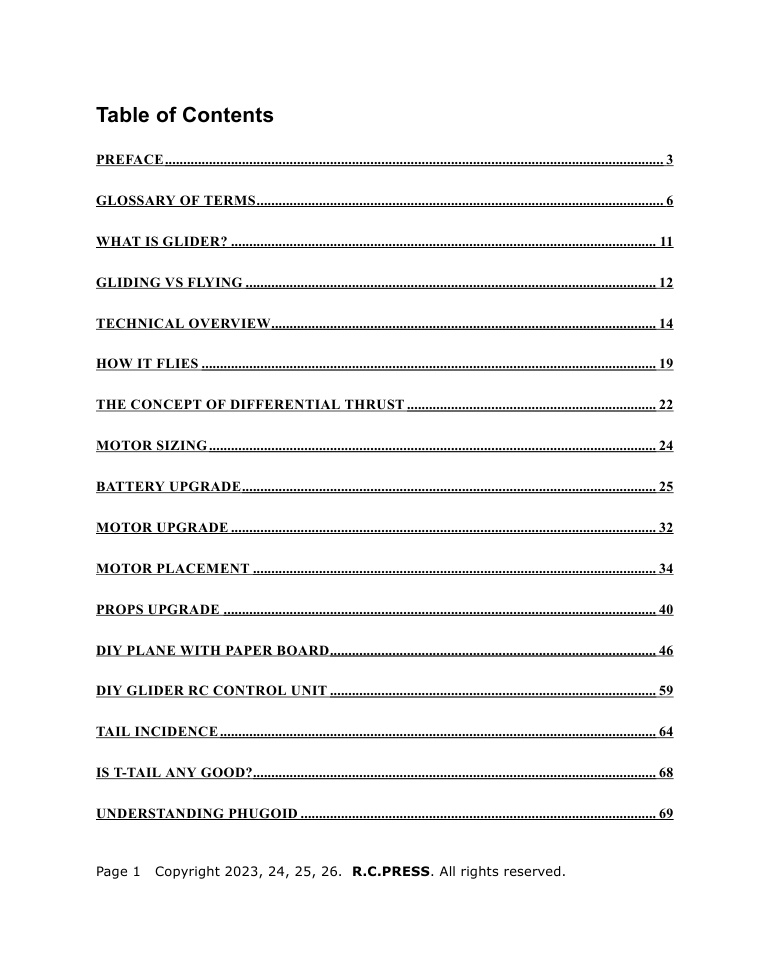 This book is about those improvements. It is about understanding what your glider is doing well and what it could do better. It is about making changes that are practical, affordable, and within the reach of anyone with basic tools and a willingness to learn. You will not find instructions for building a competition-level glider from raw materials or for installing complex flight stabilization systems that cost more than your airframe. Instead, you will find clear, step-by-step guidance for the upgrades and repair tasks that offer the greatest return on investment—in both performance and satisfaction.