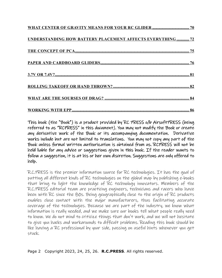 This book is written for that moment. It is for the pilot who has mastered the basics—who can launch, fly, and land without panic—and now wants to go further. It is for the builder who has assembled a kit or flown a ready-to-fly model and discovered that the real adventure begins when you start asking questions. Why does my glider sink faster than others? What is that strange oscillation I see in certain conditions? Can I add a larger propeller? How do I know when my center of gravity is truly correct? These are not problems to be solved once and forgotten. They are invitations to a deeper engagement with your aircraft and with the fascinating physics that keep it aloft.