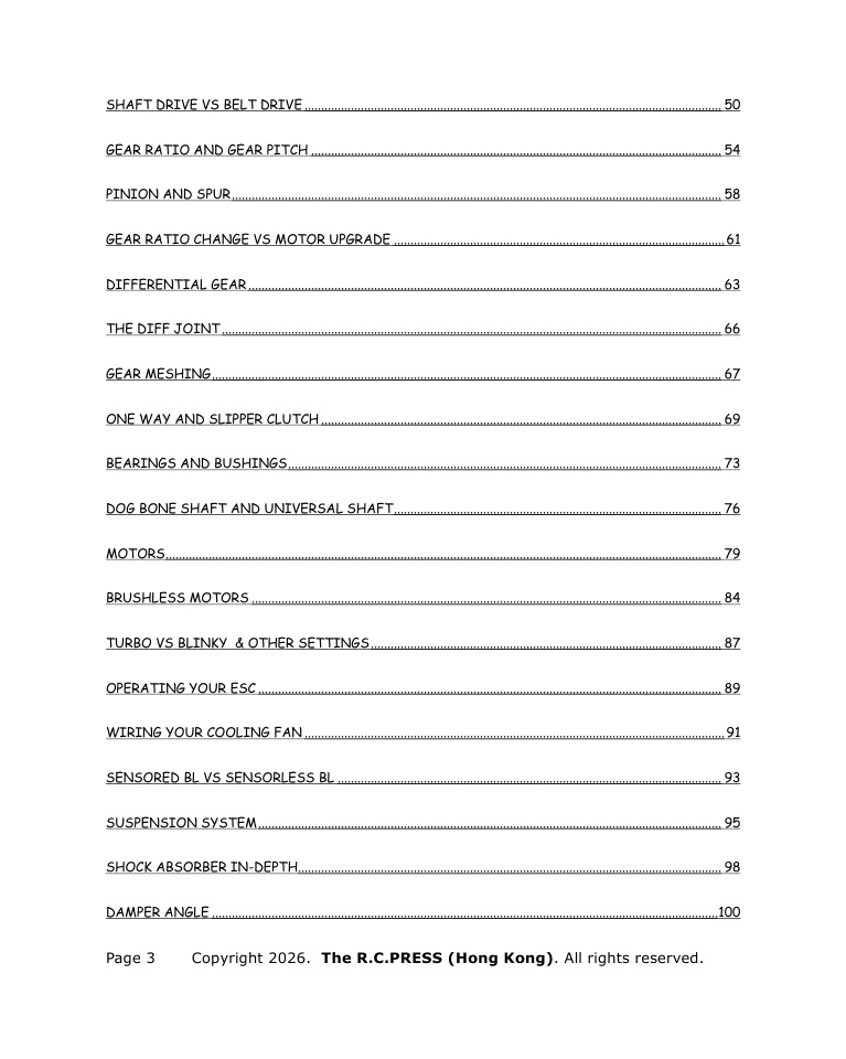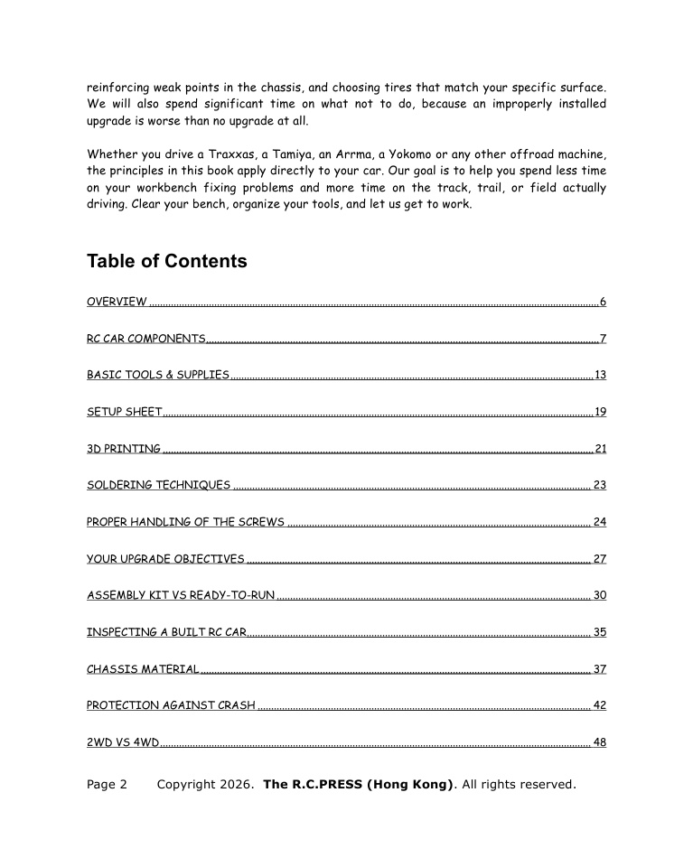Whether you drive a Traxxas, a Tamiya, an Arrma, a Yokomo, or any other offroad machine, the principles in this book apply directly to your car. Our goal is to help you spend less time on your workbench fixing problems and more time on the track, trail, or field actually driving. Clear your bench, organize your tools, and let us get to work.