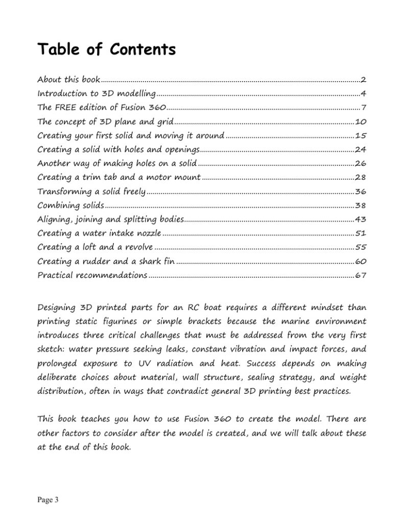 This book is specifically tailored for RC (RC speedboat to be specific). It includes contents and activities that help you learn the key concepts and usage of Fusion 360 for the design and modelling of RC parts suitable for 3D printing. It teaches you how to navigate through the Fusion 360 environment, manipulate and edit 2D sketches and 3D solids, producing components out of bodies… etc. At the end of the book you will be guided through the steps of creating some basic RC speedboat parts (turn fins, trim tab, motor mount, shaft cup, water nozzle …etc.) that can be exported to Cura for 3D printing.