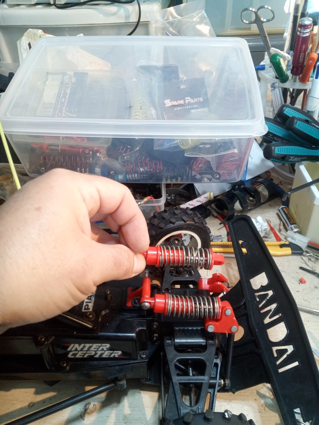 This Interceptor has all the dampers replaced with the Kyosho Optima oil dampers. Much better handling now. The key take away is that with horizontal mounting the dampers must be reasonably “soft”.