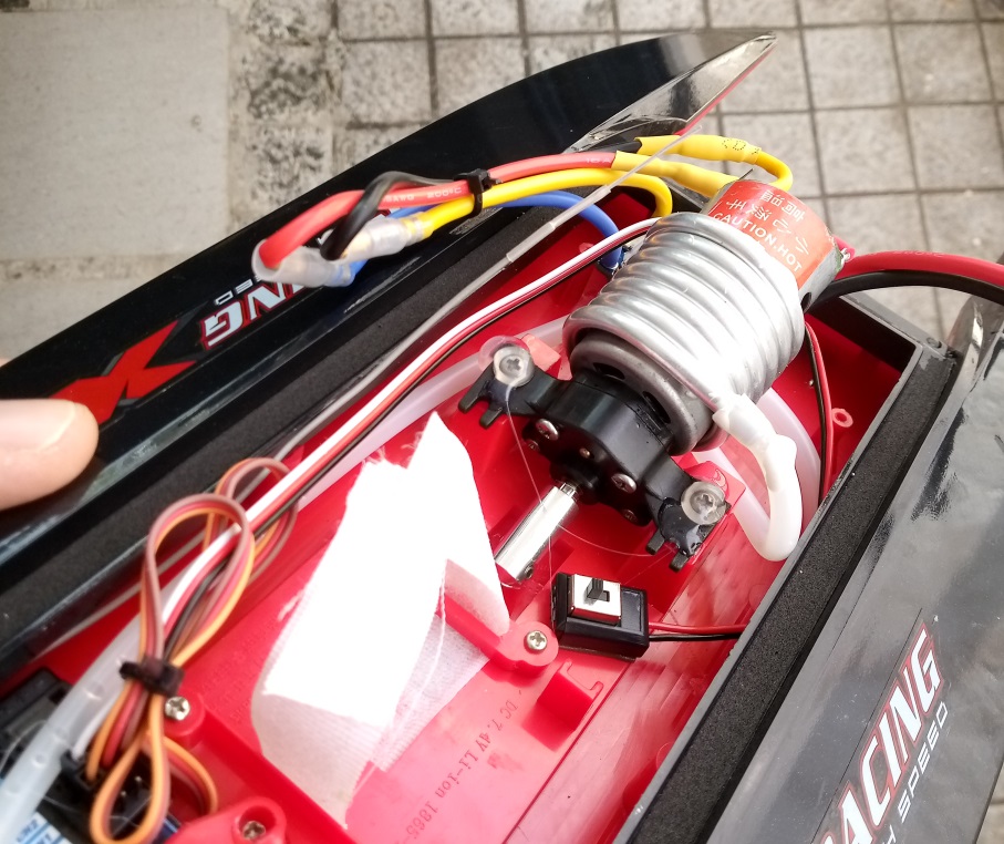 This boat has a 390 motor and a direct drive like configuration, but in fact it has a very small gear reduction setup, delivering sufficient torque and excellent performance while not over heating the motor. With a proper balance in gearing and propeller size, it goes as fast as one with a 540 motor!