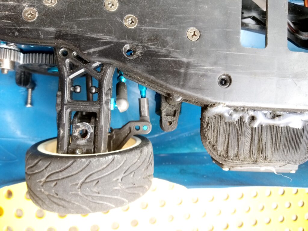 The Tamiya FF03 has a pretty weak steering structure. The screw at the bottom of the hub carrier can get loose and fall off easily since the stock hub is plastic and the small bushing that holds the screw can crack easily. To fix the problem, you either find a larger step screw that fits, or use a slightly larger screw with a small brass tubing. It is recommended that you add a bit of super glue to the screw thread for it to stay more secure in there. You need to make sure the structure is secure while not hindering steering.